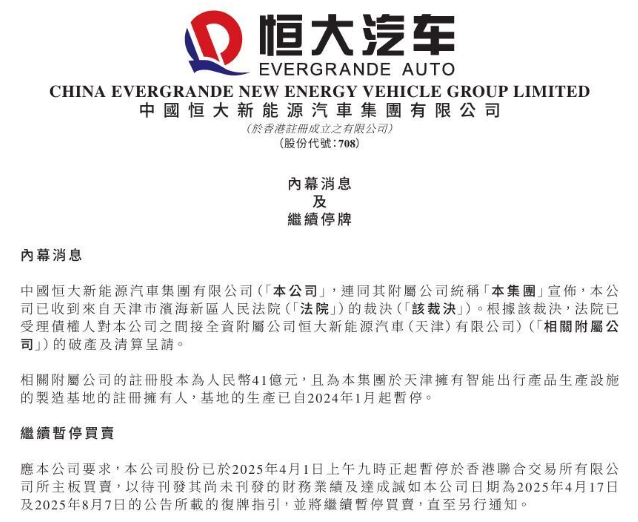 坏消息持续涌来。今年4月,恒大汽车在港交所发布公告称,间接全资附属公司恒大恒驰新能源汽车(上海)有限公司收到日期为2025年3月26日的决定书,上海市第三中级人民法院已指定一名管理人负责破产清算程序。
