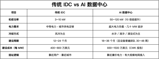 而AI数据中心最大痛点是电力指标、电网接入和冷却系统的极限性能。完全不是一个物种,IDC机房基本被归到轻工业、IT服务,到了AI数据重心属于妥妥的重工业。