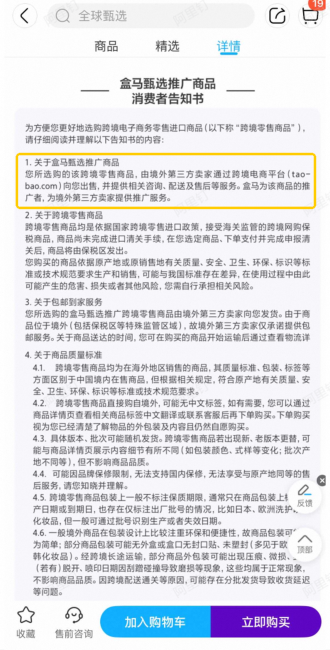 「电商在线」注意到,以上产品都被盒马归类在“全球购”板块的全球甄选系列中。据商品详情页介绍,盒马甄选推广产品由境外第三方卖家通过跨境电商平台(tao-bao.com)出售,盒马甄选则负责推广服务。