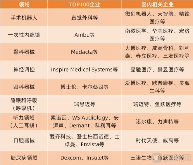纵观全球TOP100医疗器械企业,其中既有美敦力、强生等业务线广泛的企业,也有仅凭单一市场就上榜的企业,如手术机器人领域的直觉外科,一次性内窥镜领域的Ambu,骨科(关节、脊柱、运动医学)领域的Medacta,聚焦神经调控领域的Inspire Medical Systems,眼科领域的博士伦、卡尔蔡司,睡眠和呼吸领域(呼吸机)的瑞思迈……