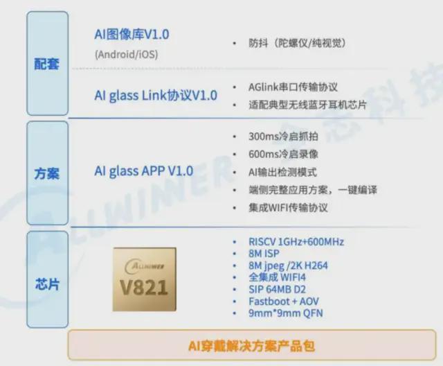 更关键的是,V821的成本极具竞争力,官方披露仅3~5美元,远低于高通AR1 Gen1约60美元的售价。基于此,全志科技推出了名为"慧眼"的AI眼镜解决方案,融合芯片层、方案层、资源层及AI大模型接口,帮助中小厂商快速完成产品定义与量产导入。