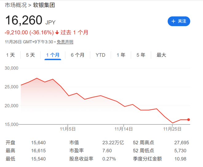 自10月底以来,软银股价已从高点暴跌约40%,市值蒸发超过16万亿日元(约合1020亿美元)。此轮抛售的核心催化剂,是市场对其主要投资对象OpenAI所面临的竞争压力感到不安,尤其是在Alphabet发布了备受好评的Gemini 3.0模型之后。