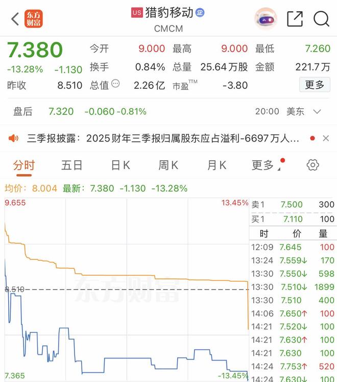 截至美东时间11月26日收盘,猎豹移动跌13.28%报7.380美元/股,总市值2.26亿美元。