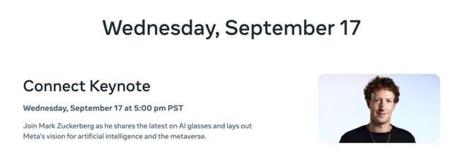 日程中的暗示与此前关于一款代号为“Hypernova”的智能眼镜的报道不谋而合。包括The Verge、The Information及知名科技记者Mark Gurman等均报道称,Meta计划在今年推出这款备受期待的产品。