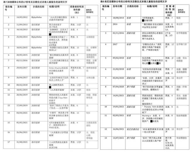 值得注意的是,由于肯尼亚与加纳两国没有对仪式杀人进行专项数据搜集,Owusu的研究数据主要依赖加纳与肯尼亚的8家官方媒体报道,考虑到仪式谋杀认定在非洲执法中处境含混,这些数字大概率是保守估计,真实案件数量可能更高。