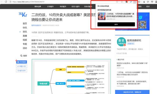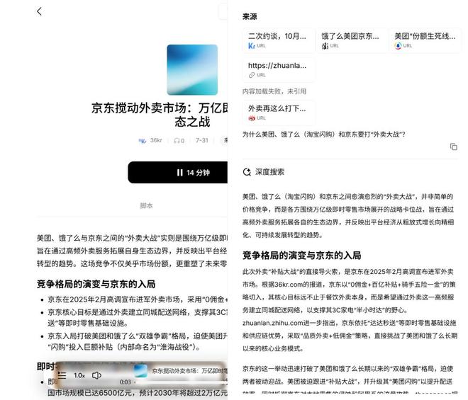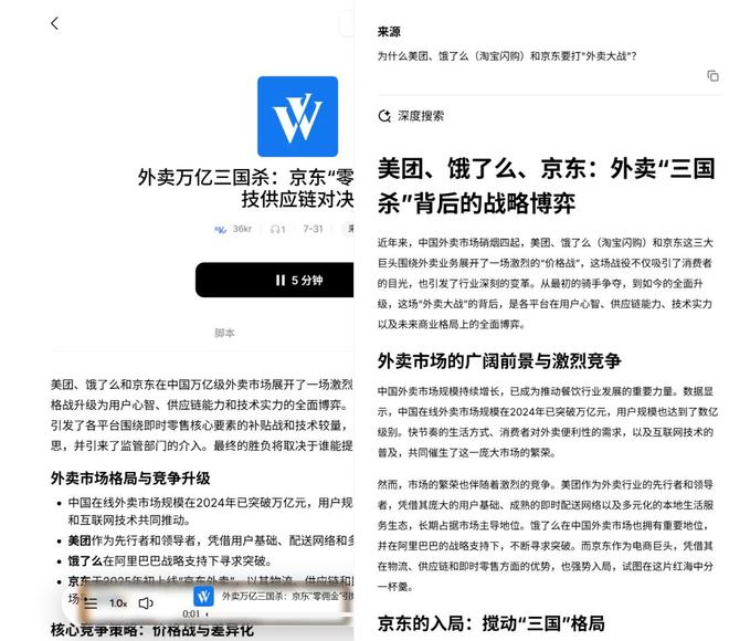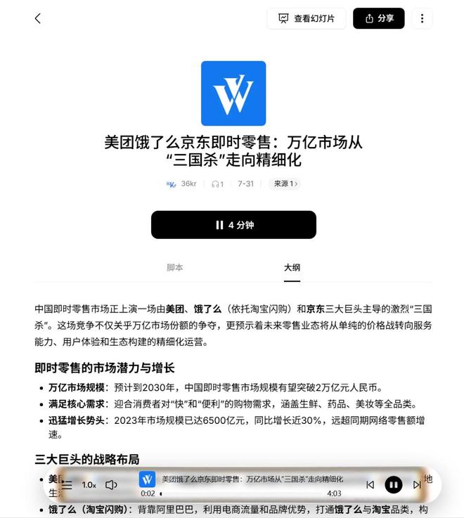出乎意料的是,ListenHub凭着一个残缺的提示词找到了正确的方向,并生成了一段标题为“美团饿了么京东即时零售:万亿市场从‘三国杀’走向精细化”的播客。