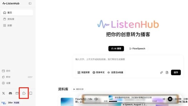 另外一个新功能叫FlowSpeech,看介绍说是全球首个能把书面语转成口语的 TTS(Text To Speech文本转语音)。这应该就是主要服务于想用它做播客的主播了,上传文件或链接,可以直接生成单人播客,语言还更加自然,对,它还挺会说人话的,最关键的是可以用自己的音色。官方对此的宣传点是“自由编辑脚本+声音定制=每个创作者的最强AI嘴替!”(听创始人说这个功能只有Google和ListenHub在做,咱也不知道是不是吹的,但反正我试了豆包一类的确实没有。而且据说已经有不少主播在用这个功能了,也是他们的主要收入来源。)