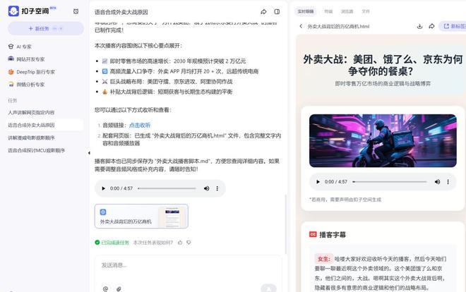 另外国内还有几家比较熟悉的AI工具也能制作播客,比如豆包和扣子空间。豆包生成播客的速度很快,大约半分钟,其实它也没完全做完,但可以边生成边听,音色也还不错,比较真实,但它不会给出对应的脚本。