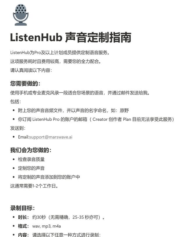 添加自己的音色对于用户端来说并不算难,只要根据他们提供的指南,录制一段自己的音频,以邮件的形式发给ListenHub官方,1-2个工作日后就可以在自己的账号中发现自己的音色了。但一定得找个安静还没有回声的地方,以自己自然的语调和声音录至少30秒。