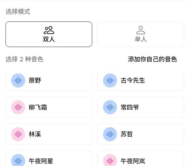 不过,据付了费的尊贵的会员朋友们说,ListenHub最近出了新功能,一个是单人模式,就是在生成播客的时候可以只选一个音色了,略去了双人播客中无用的衔接语,而以前都是默认要选两个,包括市面上其他的AI播客产品也是。