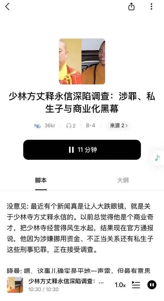 听起来有点儿意思。我把释永信的那篇公众号文章的链接贴进了ListenHub首页的对话框,选了深度探索模式,让它“详细讲讲这篇推文的内容”。大概2分钟后,它生成了一段时长10分30秒的双人对话播客。