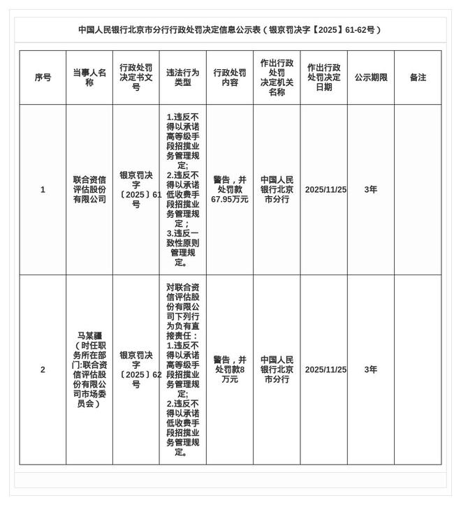 联合资信评估遭罚67.95万,责任人罚款8万曝光