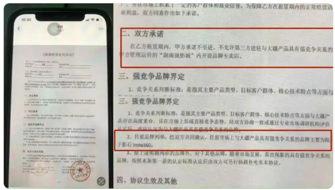 这份由摄影城物业管理方与湖南知航无人机技术有限公司签署的《商铺租赁补充协议》明确规定,“不允许第三方进驻与大疆产品具有强竞争关系的品牌于湖南摄影城内开设品牌专卖店”。协议在“强竞争品牌界定”中直接注明:“目前市场上与大疆产品具有强竞争关系的品牌主要为限于影石Insta360”。