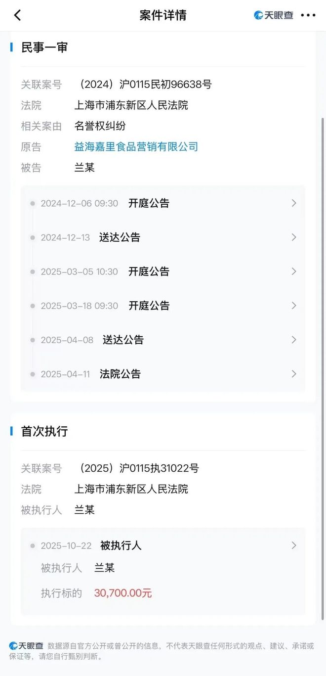 针对此事,11月25日晚,益海嘉里发布声明,强调程序正当,称因兰世立未按期履行判决才依法申请强制执行,并在事后已解冻账户,并退回兰世立多付的6.93万元。