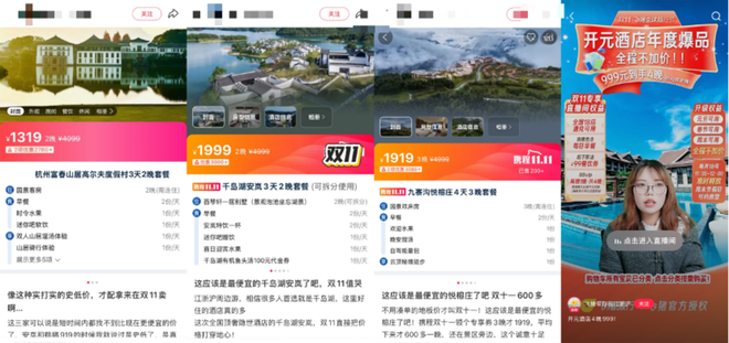 今年双十一期间,高端度假品牌的让利幅度尤为显著。比如,九寨沟悦榕庄推出1999元住3晚套餐,富春山居园景客房3天2晚活动价仅1399元,千岛湖安岚酒店同款3天2晚套餐也仅售1999元。优惠后的价格折算成单价,不仅远低于平日单晚房价,即便在过去的淡季也属罕见,如今却成为吸引客源的重要手段。