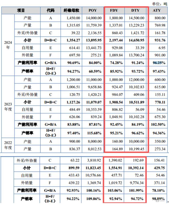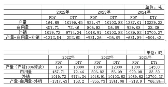 更关键的是,除2022年DTY总产量能覆盖自用量与外销量外,其余时间段FDY、DTY的自用量与外销量之和均超过总产量,超出部分需通过外购半成品或外协加工补充,而从产能潜力来看,若完全释放现有DTY产能,其产量已足够覆盖市场需求。