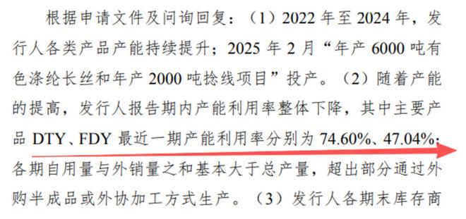 募投项目方面,欣战江此次北交所IPO的募资核心聚焦扩产,但这一计划与公司当前经营现状存在明显矛盾,已引发监管层重点问询。一方面,公司主要产品DTY、FDY的产能利用率尚未完全释放,最新数据显示分别仅为 74.6%、47.04%;另一方面,除2022年DTY总产量能覆盖自用量与外销量外,其余时间段两类产品的市场需求与自用需求之和均超过自身总产量,超出部分需依赖外购半成品或外协加工补充。