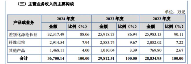 从业务上看,欣战江主要拥有差别化涤纶长丝、纤维母粒、其他产品,其中差别化涤纶长丝产生的销售收入分别为25983.13万元、25918.73万元、32317.49万元,分别占当期主营业务收入的90.11%、86.94%、88.06%,呈现出明显的产品结构单一化特征,具体情况如下: