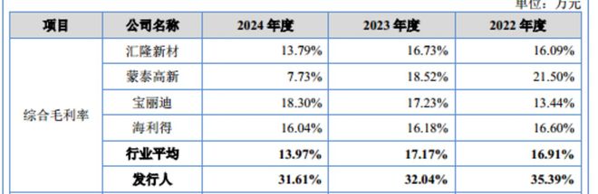值得关注的是,即便毛利率持续下滑,欣战江仍保持着远超同行的毛利率优势。公司在申报稿中选取汇隆新材、蒙泰高新、宝丽迪、海利得作为可比公司,这三家公司报告期内毛利率平均值分别为16.91%、17.17%、13.97%,而欣战江的毛利率始终超出同行均值近15个百分点,差距十分显著。