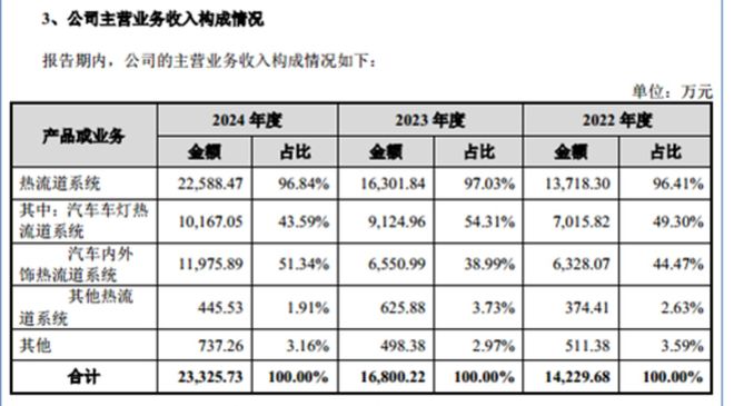 从业务结构来看,恒道科技的收入几乎全部由热流道系统构成,形成极为单一的业务架构。报告期内,恒道科技热流道系统产生的销售收入分别为13718.3万元、16301.84万元、22588.47万元,占当期主营业务收入的比例分别为96.41%、97.03%、96.84%。