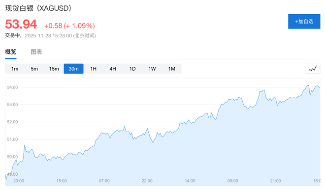 现货白银目前持稳于每盎司54美元附近,一度触及历史新高。本轮涨势已有望实现连续第七个月收涨,这将是自1980年以来持续时间最长的连涨纪录。