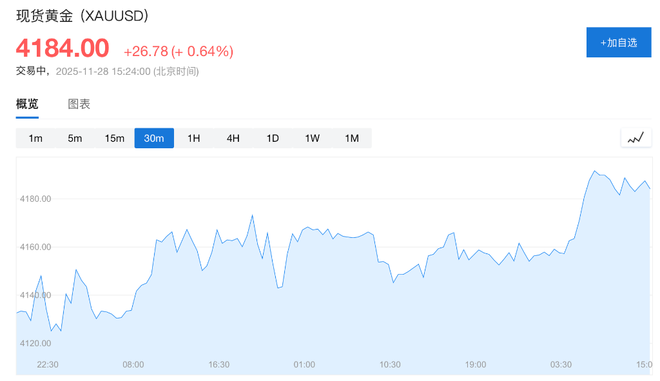 - 现货黄金上涨0.64%,至每盎司4184美元,现货白银接近54美元/盎司;布伦特原油价格持稳于每桶63美元上方