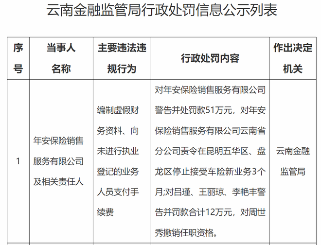 11月28日,云南金融监管局发布罚单,剑指年安保险销售服务有限公司及相关责任人。