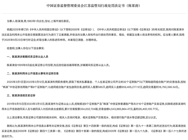 江苏证监局日前披露的一则行政处罚决定书,揭开了某券商副总裁陈某涛多年的违法违规行为。其利用未公开信息从事证券交易、违规买卖证券,被江苏证监局没收违法所得4515.05万元,并处以9030.1万元罚款,合计罚没款高达1.35亿元。
