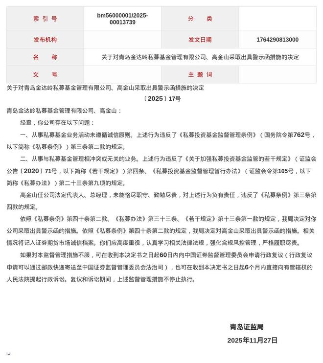 针对以上问题,青岛证监局决定对青岛金达岭私募基金管理有限公司和高金山分别采取出具警示函的措施,并记入证券期货市场诚信档案。![]()