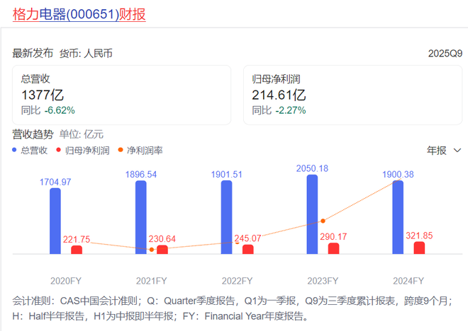 然而,全行业稳步增长的背景下,2025年三季报显示,格力电器营业总收入1376.54亿元,同比下降6.62%;归母净利润214.61亿元,同比下降2.27%。