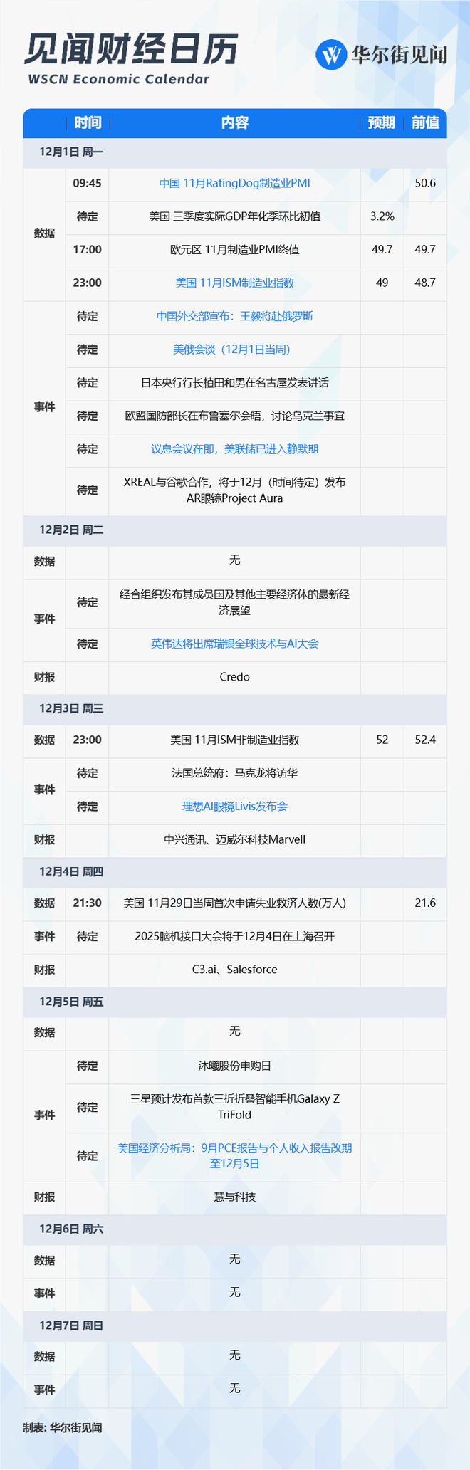 12月01日 - 12月07日当周重磅财经事件一览,以下均为北京时间: