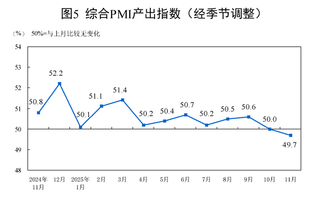 11月份,综合PMI产出指数为49.7%,比上月下降0.3个百分点。
