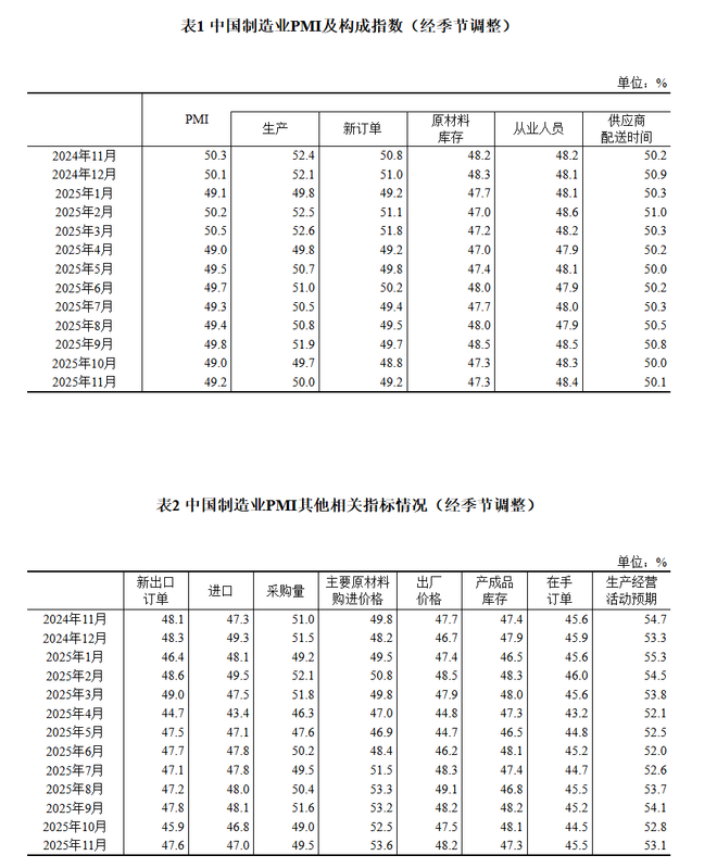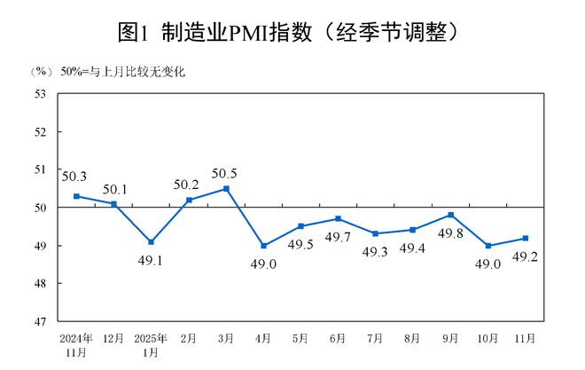11月30日,国家统计局公布数据显示,11月份,制造业采购经理指数为49.2%,比上月上升0.2个百分点;非制造业商务活动指数为49.5%,比上月下降0.6个百分点;综合PMI产出指数为49.7%,比上月下降0.3个百分点,我国经济景气水平总体平稳。