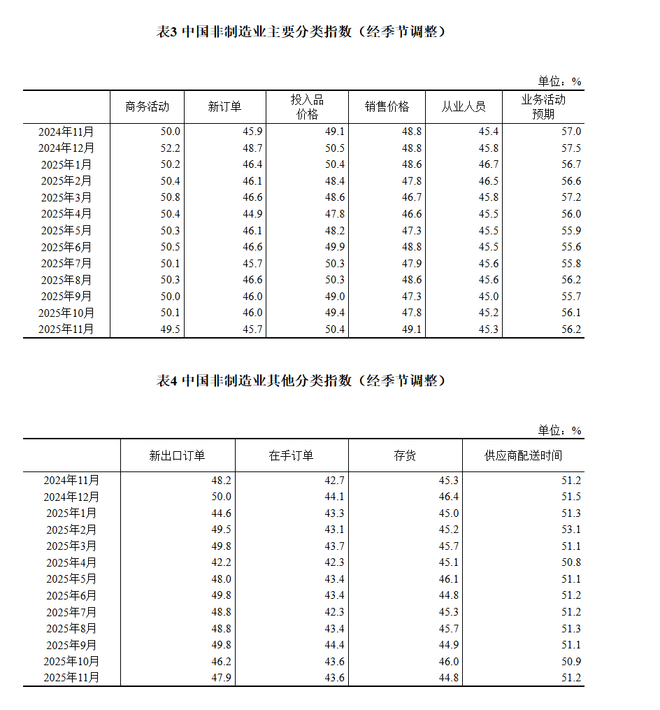 11月份,非制造业商务活动指数为49.5%,比上月下降0.6个百分点。
