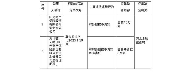 此外,时任阳光财产保险股份有限公司河北省分公司总经理助理刘计敏,对财务数据不真实负有责任,被警告并罚款8万元。