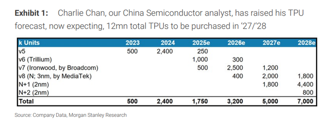 大摩预测,谷歌TPU产量至2027年将大幅上升,预计达500万块,外销增收潜力巨大