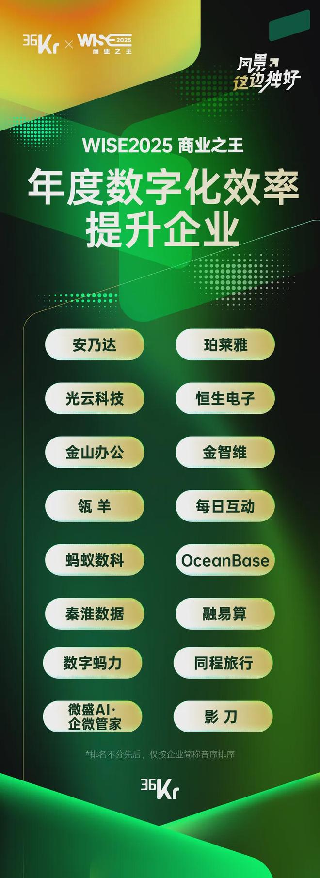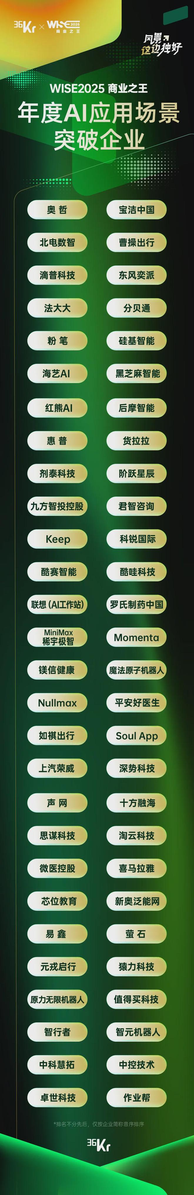 在此背景下,36氪正式发布「WISE2025 商业之王 年度企业系列名册」。我们聚焦十大关键方向,系统梳理在AI、数字化、先进制造、消费品牌、文化内容、低空经济、跨境服务、生态赋能、孵化支持、商业潜力等方面表现卓越的代表性企业与平台。
