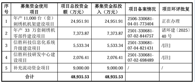 而本次募投项目“年产11,000台(套)刺绣机机架建设项目”,主要实施主体为信胜机械,项目达产后,将年产6000台多头刺绣机、5000台单头刺绣机所需的机架。