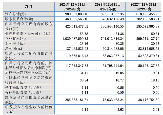 业绩方面,2022年至2024年,公司营业收入分别为6亿元、7.04亿元、10.30亿元;归母净利润分别为5259.84万元、5886.23万元、1.20亿元。