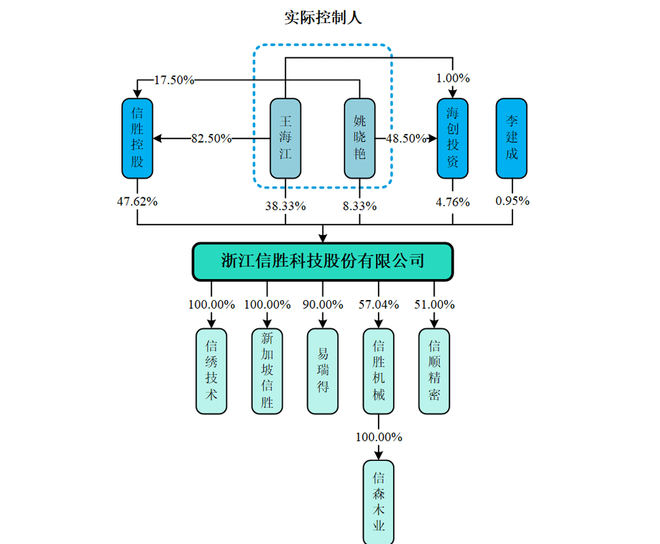 股权方面,王海江及姚晓艳夫妇直接持有公司股份的比例为46.67%,通过信胜控股和海创投资控制公司的股份比例为52.38%,合计控制公司99.05%的股份对应的表决权,系公司实际控制人。