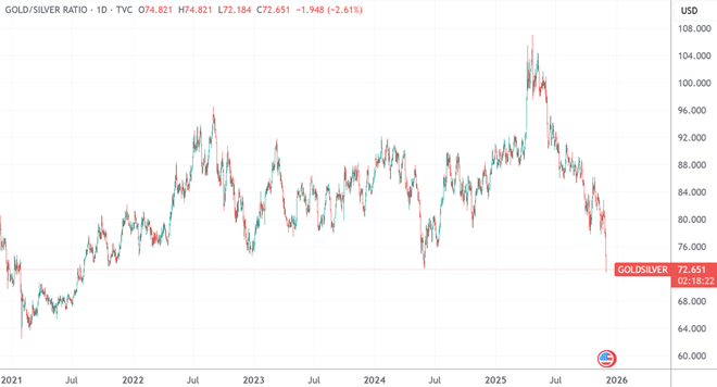 金银比是指每盎司黄金能换多少白银,目前已经触碰2021年8月以来的低点。