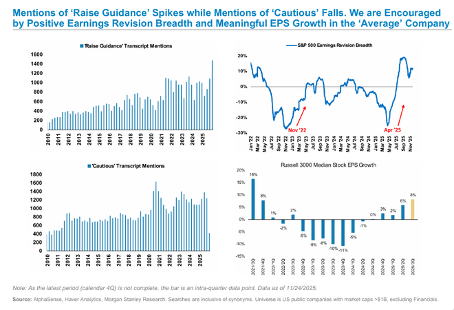 这种乐观情绪也反映在更广泛的盈利预期上。报告显示,标普500指数的盈利修正广度(Earnings Revision Breadth)出现积极上行,同时罗素3000指数中位数公司的EPS增长率也展现出强劲的复苏态势。摩根士丹利策略师对这些信号感到“鼓舞”。