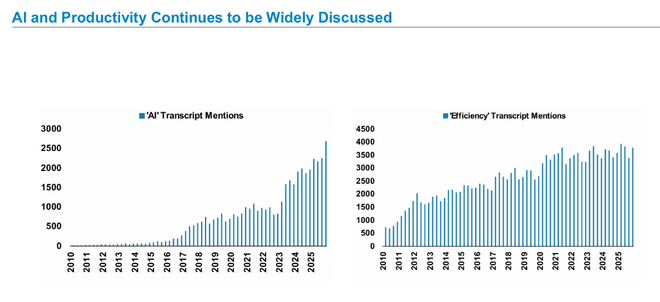 人工智能正从一个热门概念转变为实实在在的生产力工具。报告显示,企业财报会议中提及“AI”、“效率”和“生产力”的频率均创下新高。AI的应用正成为推动企业利润率扩张的重要力量。