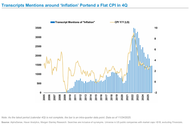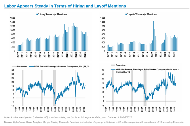 劳动力市场也呈现出“净中性”的态势。尽管“招聘”和“裁员”的提及次数同步温和上升,但并未出现急剧失衡的迹象,有关劳动力成本上涨的担忧则有所降温。