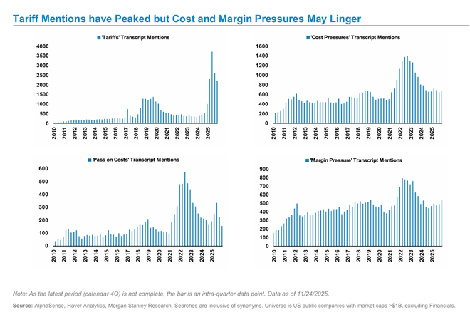 数据显示,企业财报会议中“关税”一词的提及次数已达峰值并开始回落。一些公司不仅完全化解了关税的负面影响,甚至在关税税率低于预期时,其业绩表现超出了市场预期。例如,通用汽车就表示,已通过各种措施完全抵消了关税的影响。摩根士丹利分析称,成功的关税管理为企业在2026年创造了更有利的业绩比较基数。