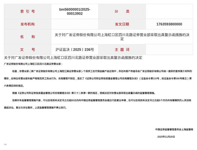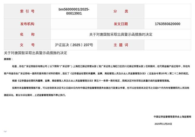 蓝鲸新闻12月2日讯,近日,中国证券监督管理委员会上海监管局发布了行政监管措施决定书,剑指广发证券股份有限公司上海虹口区四川北路证券营业部及唐国智。