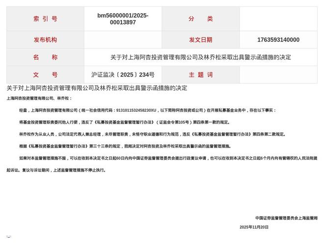 蓝鲸新闻12月2日讯,近日,中国证券监督管理委员会上海监管局发布了一则行政监管措施决定书,剑指上海阿杏投资管理有限公司及林乔松。