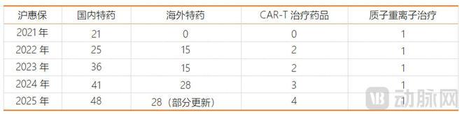 在惠民保中,覆盖医保外费用的条款通常被作为核心保障。以国内参保人数最多的沪惠保为例,保障条款主要就集中在医保外的自费部分,包括特定住院自费医疗费用保险金、国内特定高额药品费用保险金、质子重离子医疗保险金、海外特殊药品费用保险金和CAR-T治疗药品费用保险金。此外,沪惠保自2021年4月上线以来,经过了保障条款的多次迭代,其中一个重要模块即更新新特药目录。在2025版的沪惠保中,已经有48款国内特药、15款海外特药、4款CAR-T治疗药物和1款质子重离子治疗被纳入报销范围。