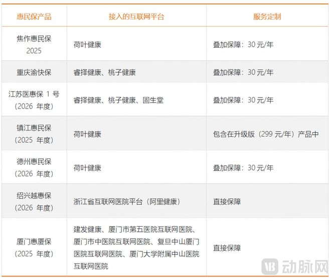 近两年,在主体保险条款之外设置附加险,或者在基础版产品之外增加升级版,成为惠民保的另一个趋势。动脉网注意到,在这些叠加的保障中,增设互联网门诊险成为主流。据动脉网不完全统计,焦作、重庆、江苏、德州等多地惠民保,通过叠加保障或者升级保障的方式,覆盖互联网医院门诊的医疗费用支出,绍兴和厦门则直接接入互联网医院平台。
