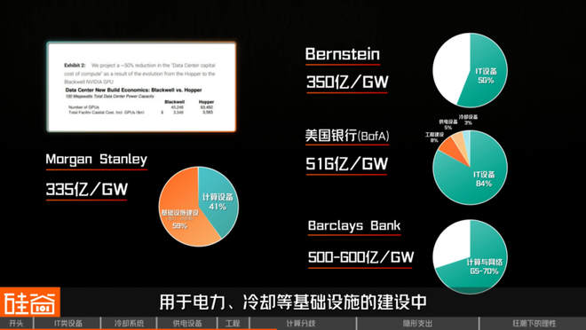 Morgan Stanley 8月的研究模型:1GW对应的成本是335亿美元,其中计算设备占比为41%,而剩下59%用于电力、冷却等基础设施的建设中。